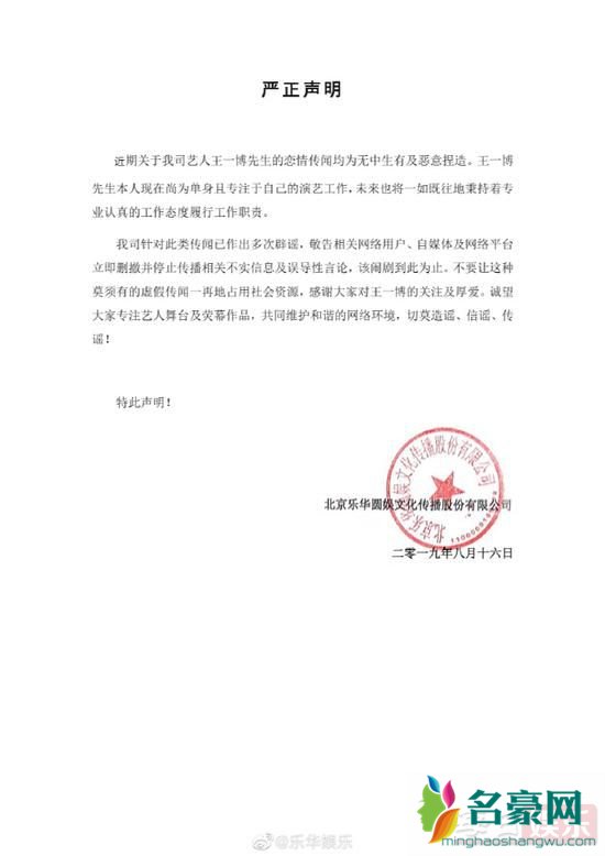 乐华娱乐在文中表示,王一博现在正在专注于自己的演艺工作,而且关于他恋情的消息也属于是恶意捏造,公司曾多方面进行辟谣,希望大家切莫造谣、传谣等。