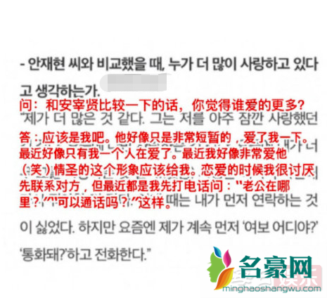而具惠善近日接受采访中提到,安宰贤好像只是很短暂地爱了一下,而自己爱得更多。