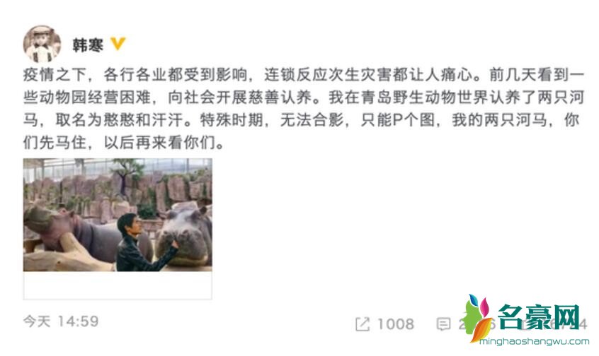 近日,韩寒在社交平台上更新了动态,韩寒发文表示:“疫情之下,各行各业都受到影响,连锁反应次生灾害都让人痛心。前几天看到一些动物园经营困难,向社会开展慈善认养。我在青岛野生动物世界认养了两只河马,取名为憨憨和汗汗。特殊时期,无法合影,只能P个图,我的两只河马,你们先马住,以后再来看你们。”