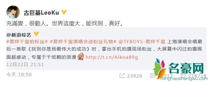 随后,古巨基在微博上和易烊千玺互动,点赞称“充满爱很动人!”古巨基转发易烊千玺翻唱自己的歌曲《找到你是我最大的成功》视频,并点赞称:“充满爱,很动人。世界这么大,能找到,真好。”