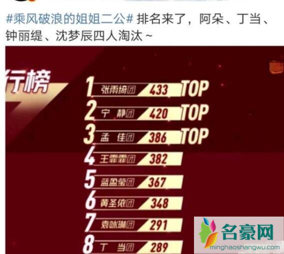 张雨绮组第一个出场获得了如此成功,也激励了接下来出场的姐姐们,随后的七个舞台表演也都很精彩,而八组选手的排名也相继出炉,张雨绮组第一,丁当组垫底,对于谁会被淘汰网上有一份名单:阿朵、沈梦辰、钟丽缇和丁当。