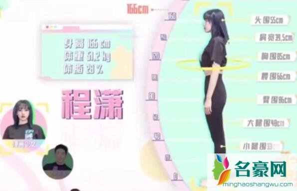 2020年9月19日播出的《哎呀好身材2》第一期节目,嘉宾们的身高体重还有体脂等数据公开,毕竟这是一档健康的节目,测数据是为了看一下他们的身体问题,从而改掉这些不良生活习惯。程潇身高166厘米,体重102.4斤,体脂28%,胸围85cm,腰围66cm,臀围86cm,这数据一出,在演播室的姐妹们发出了哇哦的羡慕声,毕竟单纯从外表上看,程潇绝对是那种穿衣显瘦,脱衣有肉,所有的肉肉都长在了该长的地方,身材比例真的非常完美。