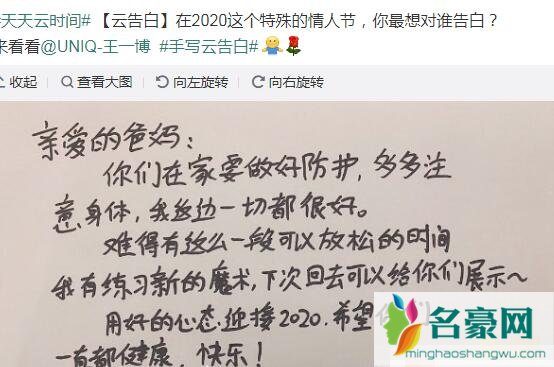 2020年2月20日《天天云时间》新一期节目播出,这一天非常有纪念意义20200220,是不是很对称,节目组也专门设置了云告白环节,我们看到王一博书写信的内容:亲爱的爸爸妈妈在家请做好防护,多多注意身体,自己在这边一切都好。有了这么一段休息的时间,自己有练习新的魔术,下次见面的时候会表演给你们看,2020年希望用好的心态去迎接,也希望你们能够健康、快乐。