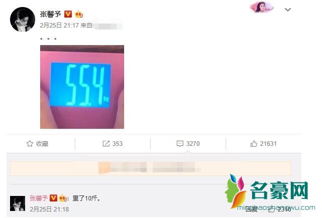近日,张馨予在社交平台上更新了动态,张馨予晒出了一张自己的体重照,体重秤上显示的是55.4公斤,直呼胖了十斤,要面对现实了。对于张馨予的体重,瞬间吸引了众多网友围观。