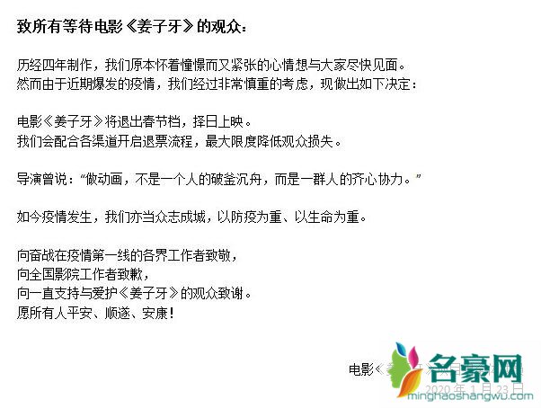 原本今年的贺岁档竞争将十分激烈,《囧妈》、《夺冠》、《姜子牙》、《唐人街探案3》等都是备受大家期待的片子,但是现在疫情日益严重起来,《姜子牙》片方权衡再三,还是决定退出春节档,等情况有所好转后再找时间重新上映。《姜子牙》片方的做法引来了网友们的称赞和好评,毕竟电影很早之前就开始预售了,已经买票的观众不在少数,过年看电影现在已经是很多人的必备行程,但今年这样的情况发生的很突然,令人猝不及防。