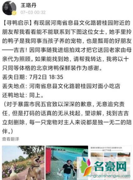王珞丹发微博后越来越多的网友都开始关注这件事,因为这几年养宠物的风潮兴起,而宠物也不再局限于猫猫狗狗,很多人都喜欢养小鸭子作为宠物,其中有一种柯尔鸭更是价格昂贵,一只价格有的可以达到上万块。王珞丹并没有说自己同事的宠物鸭是什么品种,但是从她发出来的照片上看,王珞丹同事丢失的宠物鸭应该就是柯尔鸭。而且最重要的不是鸭子的品种,而是王珞丹的同事在饲养这只鸭子时倾注的情感,这才是最珍贵的,也是他们为什么这么执着的想要找回鸭子。