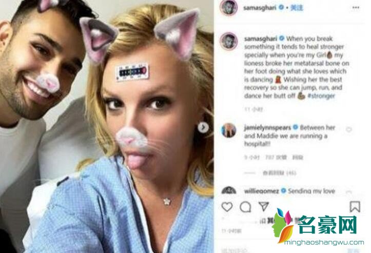 近日,布兰妮男友山姆·阿斯加里(SamAsghari)在社交平台上更新了的动态,山姆·阿斯加里晒出了与布兰妮在医院的合影,照片中,穿着病号服的布兰妮兴致勃勃,坐在床上冲镜头吐舌卖萌,还配上狗狗的滤镜。