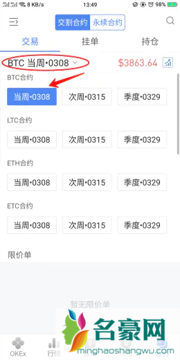 3.选择合约类型:选交割合约----点击红色圈内---当周合约。(短线操作建议当周合约,长期操作建议季度合约,季度合约交割时间充裕,可以短期也可以长期持有)选择币种:建议主流币种,小币种其交易深度不足。