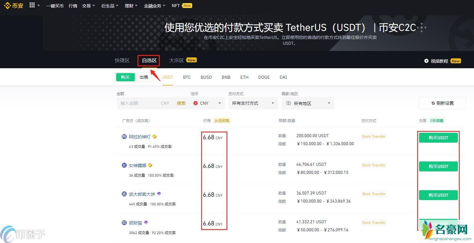4、然后选择【自选区】,根据金额,付款方式等选择合适的商家,点击【购买USDT】。根据弹窗提示向卖家付款,点击“我已付款”等待卖家放币即可。