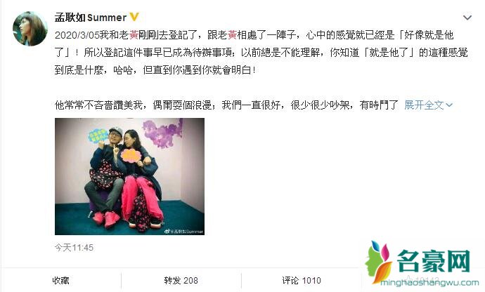 黄子佼于3月5日与孟耿如登记结婚,但是因疫情原因两人决定将婚宴延期,近日黄子佼在微博晒出两人婚纱照,月30日,黄子佼在微博分享一张与爱妻孟耿如的婚纱照,并发长文: 控制不了疫情但能控制爱,爱你爱他也爱自己爱世界,愿爱的婚纱照疗愈星期一。这只是其中一组婚纱照片,另外一组场景与造型加上前年偷带健康元气预拍的,都想等喜宴再曝光分享咯!