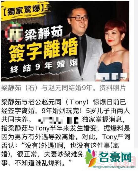 2019年8月,台媒爆料称梁静茹与丈夫赵元同签字离婚结束9年婚姻,5岁的儿子由两人共同抚养。消息刚刚传出时候,赵元同回应称只是夫妻吵架,“夫妻吵架难免,都是为了小事,不知道谁乱爆料”。