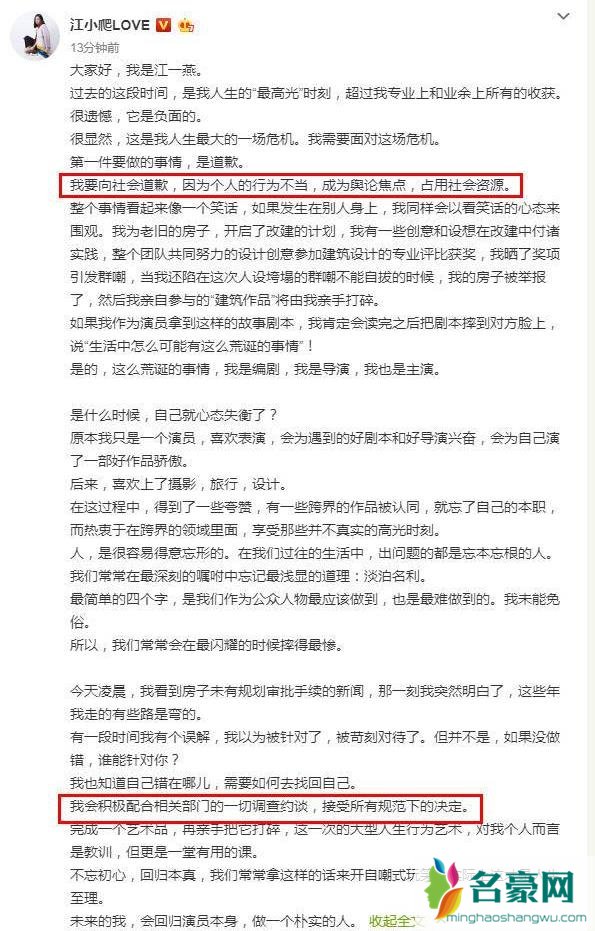 江一燕道歉说了什么?