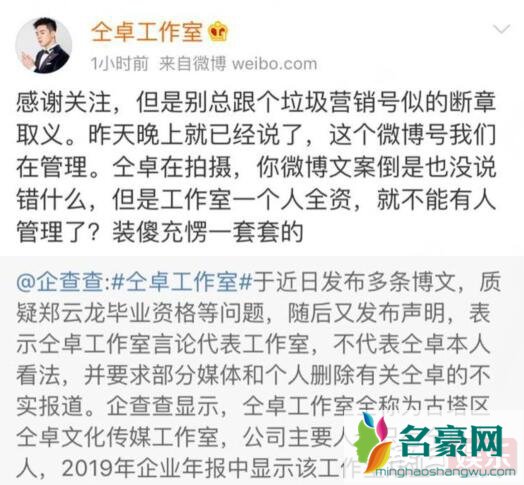谁知这件事的热度还没下去,企查查指出仝卓工作室目前只有仝卓一个人。网友们得知这个消息哭笑不得,感觉仝卓一系列操作都太打脸了。事后仝卓工作室就此给出回应,称“工作室一个人全资,就不能有人管理了?”