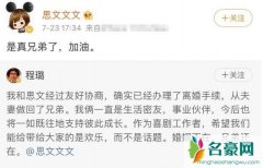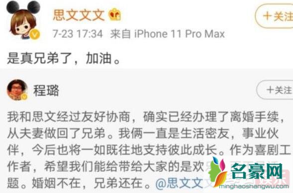 7月23日,程璐在微博发文称,与思文正式离婚。随后思文转发程璐的微博,并表示真的做回真兄弟了。思文今年三十五岁,程璐今年三十四岁,在很多人眼里看来,思文比程璐要成熟很多,而且思文在外也显得比较强势,是一个典型的女强人,所以网上也有消息传出程璐是吃软饭的。
