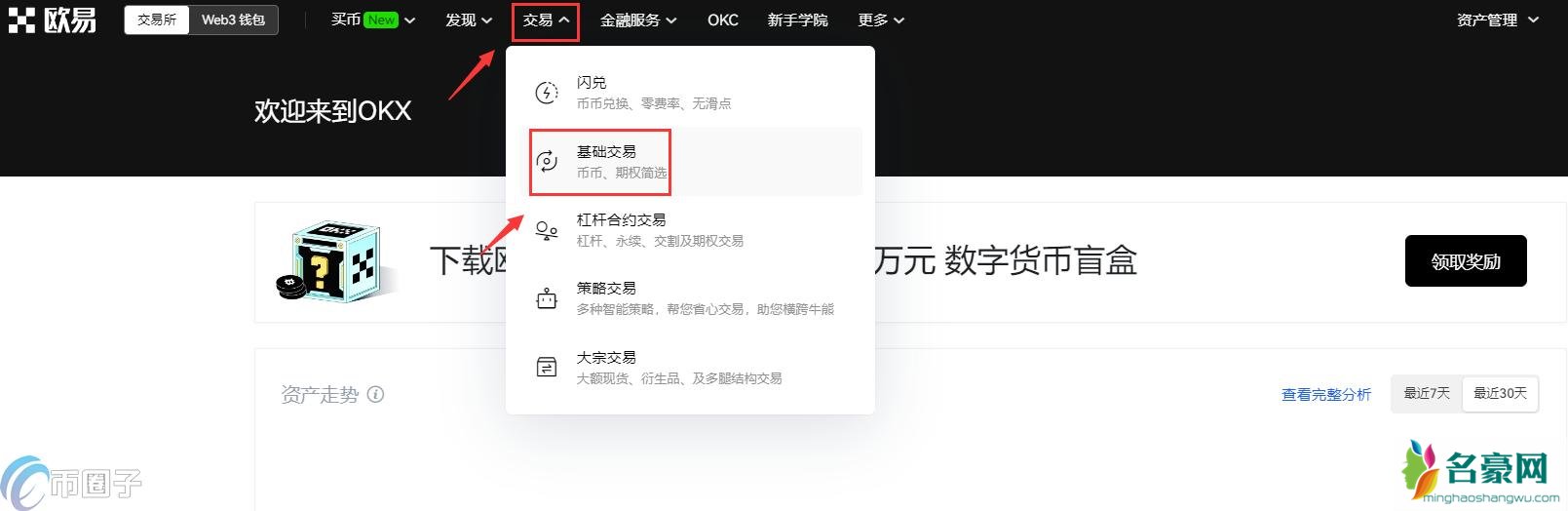 第一步:点击欧易OKX交易所官网,没有账号可以点击注册一个账号。点击交易--基础交易,进入交易页面