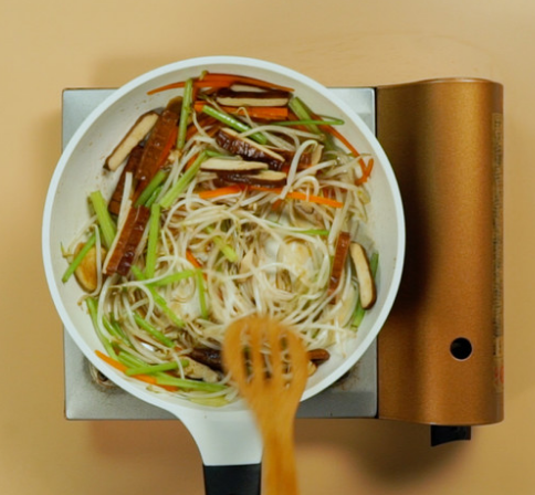 倒入豆芽、胡萝卜丝、芹菜、香干