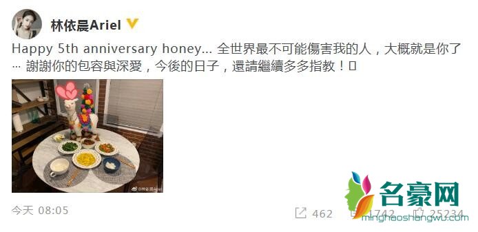 近日,林依晨在社交平台上更新了一条动态,林依晨晒出了一张家常饭菜照片,并且配文表示:“Happy5thanniversaryhoney...全世界最不可能伤害我的人,大概就是你了?谢谢你的包容与深爱,今后的日子,还请继续多多指教!”