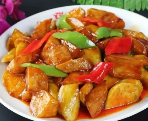 11.下入炸好的土豆块,茄子块和青辣椒翻炒几下