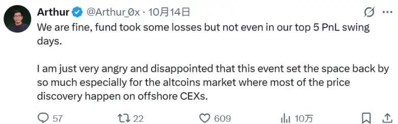 曾在上个周期凭借押注多个DeFi项目而风光无限的DeFiance Capital在本次崩盘事件中遭受损失。10月14日,其创始人Arthur在社交媒体上发文表示,“我们没事,基金出现了一些亏损,但排不进我们前五大盈亏波动日。我只是非常愤怒和失望,本次暴跌事件让整个加密领域大幅倒退,尤其是对山寨币市场而言,因为大部分价格发现过程都是在离岸CEX进行的。”