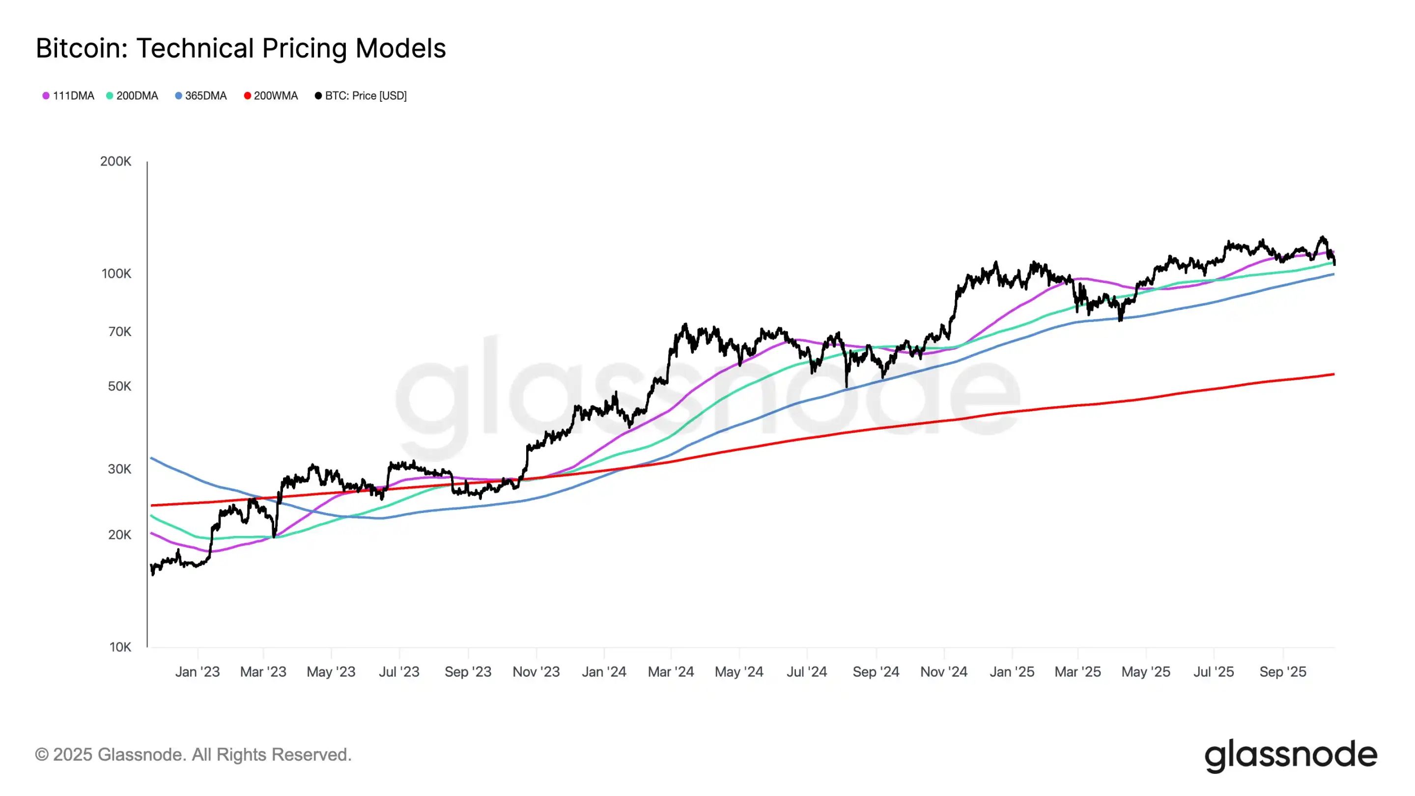 glassnode则发推表示,比特币当前处于关键支撑位区间,价格位于200日移动平均线(107,400美元)下方,且刚好在365日移动平均线(99,900美元)上方,同时上方还有111日移动平均线(114,700美元)的压制。