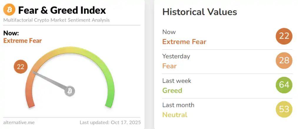 Coinglass数据显示,过去24小时,全网未平仓合约爆仓11.89亿美元,多单爆仓9.35亿美元。最大单笔爆仓单发生在Hyperliquid - ETH-USD价值2042.74万美元。alternative数据显示,目前市场恐慌指数已低至22,陷入极度恐慌。
