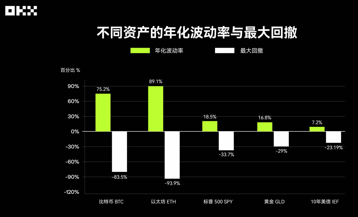加密资产的波动性远超传统资产。据 Digital One Agency 数据,比特币的年化标准差约为 70%-90%,而标普 500 指数仅为 15%-20%,这种巨大的波动性直接导致了惊人的最大回撤:在过去的 10 年中,比特币和以太坊经历了多次超过 70% 的深度回撤,例如 2018 年的熊市,BTC 价格从近 2 万美元跌至约 3 千美元,回撤幅度超过 80%。标普 500 最大的回撤发生在 2020 年 COVID-19 疫情初期,约为 -34%。历史上的 2008 年金融危机期间,回撤曾超过 50%。黄金则表现相对稳定,过去 15 年的最大回撤约为 -29%。美国国债作为避险资产,其回撤幅度最小,但受利率周期影响,在 2020 年后的加息周期中也经历了约 -23% 左右的最大回撤,打破了其「无风险」的神话。