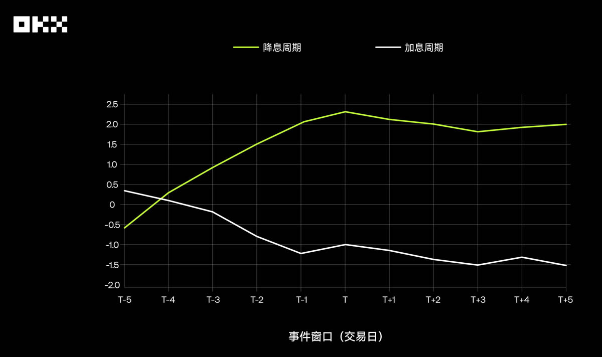 下图展示了在加息和降息事件窗口期(T-5 至 T+5 日),比特币相对于标普 500 的平均累计超额收益(CAR)。可以看出,在降息周期中,比特币在决议公布前有显著的正向超额收益,而在加息周期中则不明显,甚至为负。这表明市场对比降息的反应更为积极和提前。