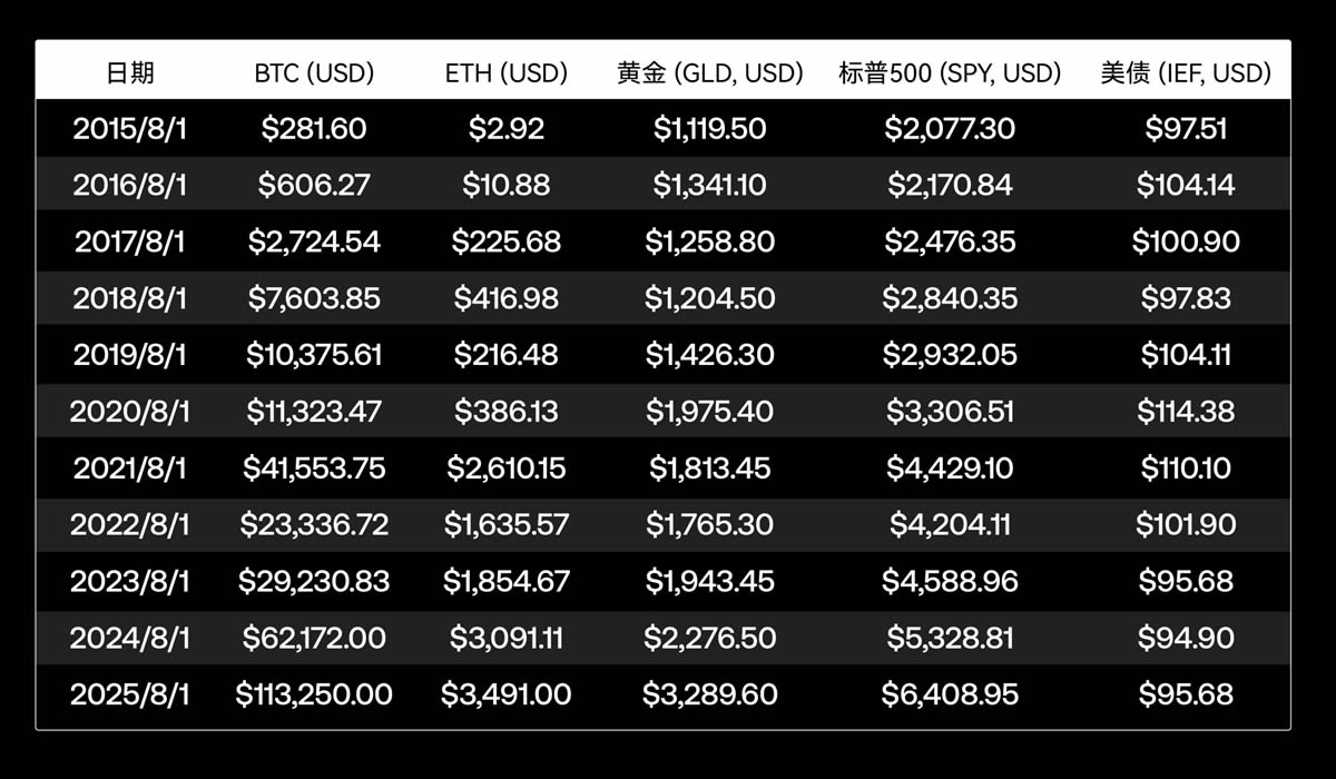 下表记录了从 2015 年至 2025 年,在每年的 8 月 1 日(或其后的首个交易日)五种核心资产的收盘价格。