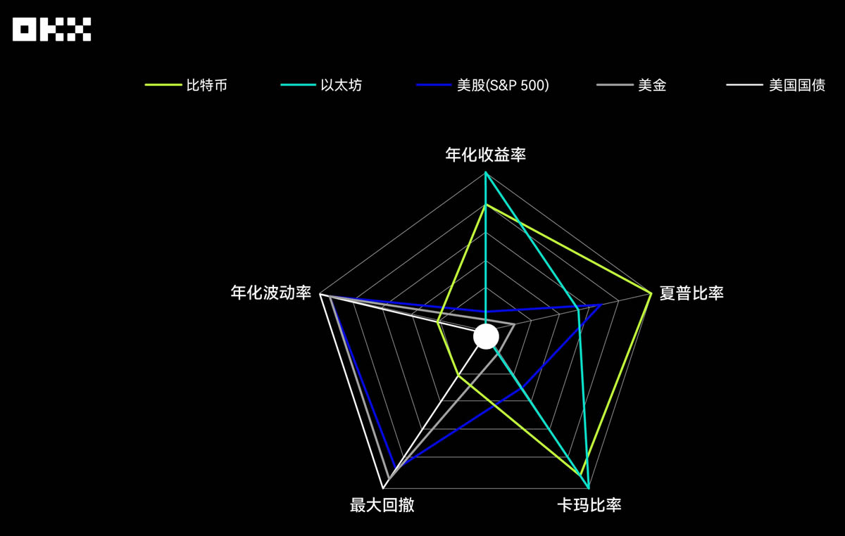 比特币和以太坊的雷达图形状最为「激进」。它们在年化收益率和卡玛比率两个维度上表现出无与伦比的优势,形成了两个向外的尖角,这体现了它们在过去十年中惊人的财富增长效应和强大的回撤后恢复能力。然而,这种高回报并非没有代价。在最大回撤和年化波动率两个维度上,它们的得分是所有资产中最低的,这意味着其图形在这两个方向上严重内缩,构成了明显的「短板」。这清晰地揭示了加密资产高风险、高波动的本质。值得注意的是,比特币的夏普比率表现优于以太坊,说明在风险调整后,比特币的投资效率略胜一筹。
