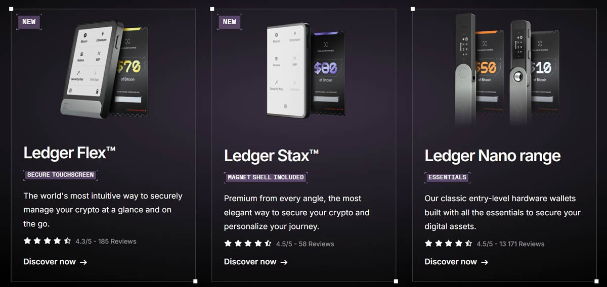 | 产品 | Trezor Safe 5、Trezor Safe 5 仅限比特币、Trezor Model T、Trezor Safe 3、Trezor Safe 3 仅限比特币、Trezor Model One。 | Ledger Stax、Ledger Flex、Ledger Nano X、Ledger Nano S Plus。 |