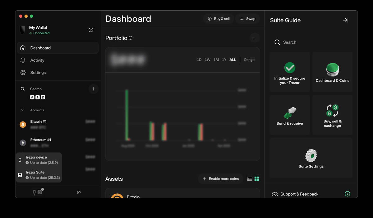 Trezor 和 Ledger 钱包都易于使用。不过,Trezor 设备,尤其是 Trezor Model One 和 Trezor Model T,更适合新手。Trezor 硬件钱包在台式机、笔记本电脑和移动设备上的安装也非常简单。您只需设置恢复短语和 PIN 码即可开始使用。此外,Trezor 钱包拥有直观的界面。