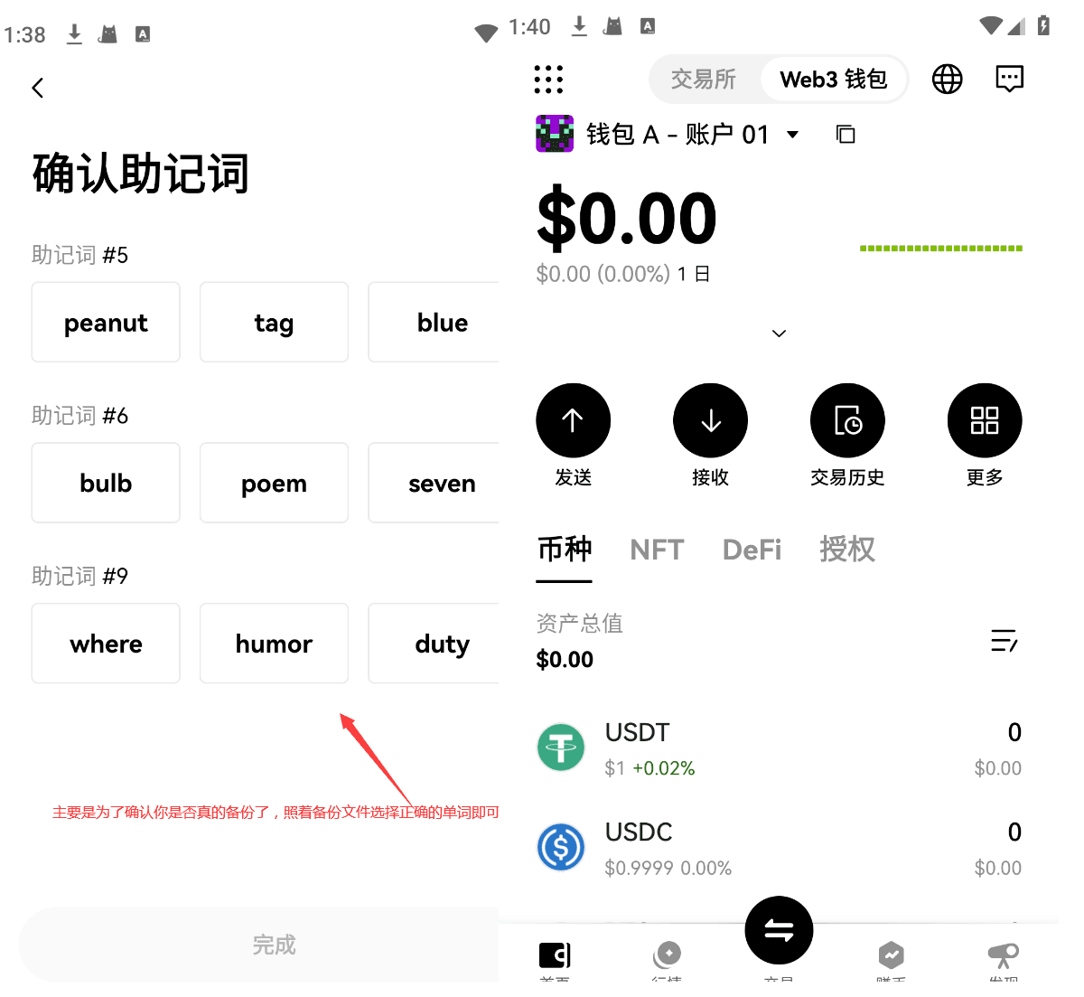 确认 助记词 是否 正确备份,选择正确了才可以进行下一步 点击完成就备份ok了