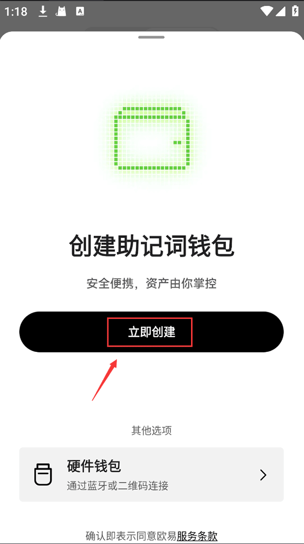 4、选择创建钱包的方式,助记词钱包或者硬件钱包2种,这里以助记词钱包的方式展开讲解,点击立即创建;
