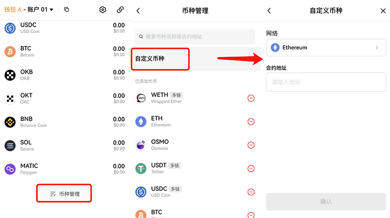 如果要收款的币种不在已添加币种内,在钱包首页下拉至币种管理并点击 > 自定义币种,选择对应的网络,输入合约地址,点击确认完成添加。