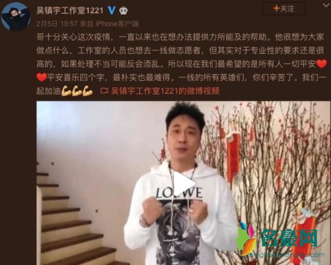 近日,吴镇宇工作室在社交平台上更新了一条动态,工作室晒出了吴镇宇为武汉奋战一线的英雄们加油,并且配文表示:“哥十分关心这次疫情,一直以来也在想办法提供力所能及的帮助。他很想为大家做点什么,工作室的人员也想去一线做志愿者;