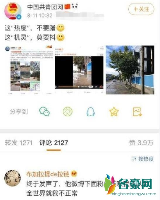 在8月11日中午,共青团在微博上发文声称:“这“热度”,不要蹭,这“机灵”,莫要抖!”并且还配上了一段薛之谦在洪水中抱着一根电线杆的视频,批评薛之谦!