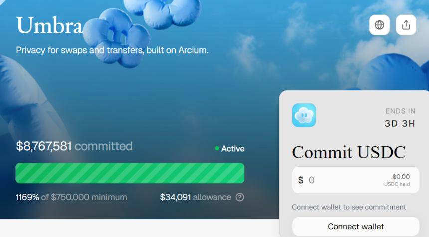 10月6-8日,Solana隐私协议Umbra在MetaDAO的futarchy平台上进行ICO,原定筹资$75万,最终获得$880万超募1100%左右。