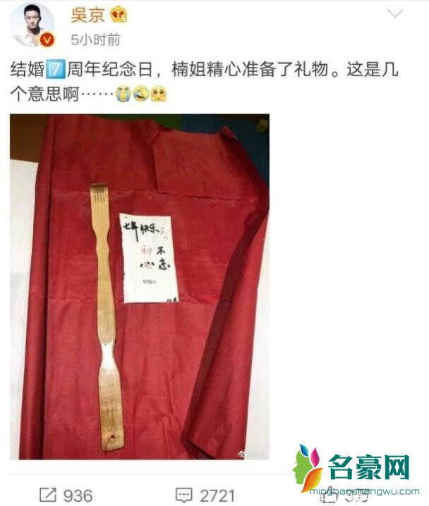 近日,吴京在微博上晒出了谢楠送给他的礼物,吴京并且配文表示:“结婚7周年纪念日,楠姐精心准备了礼物。这是几个意思啊...”照片中,谢楠只送了一个痒痒挠给吴京,而且还写着纸条,“七年快乐,不忘初心”。