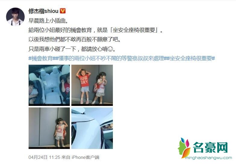 而修杰楷发生车祸让很多粉丝表示担心,不过只不过是车辆发生了小摩擦而已,而修杰楷用这次的小事故教育孩子的做法,受到大家的支持和赞赏。小编觉得安全教育就是应该从小孩抓起的,让她们从小懂得安全的重要性。