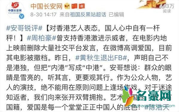 据悉,之前周柏豪疑似支持“港独”,因为曾与“港独”头目黄之锋合影,并且还唱“港独赞歌”、发贴支持示威者等等,虽然之后被周柏豪删除了,但是依旧留下了污点。