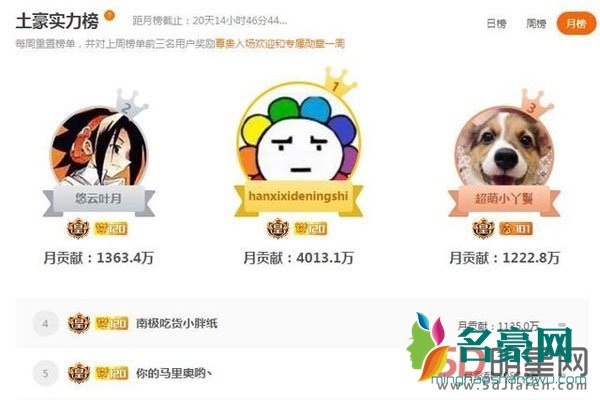 去年年度斗鱼年度十大巅峰主播之战的时候,大家可以很清楚的看到斗鱼游戏区土豪势力榜上的第一名就是旭旭宝宝的老婆茜皇,她以400万满级排名第一,可谓是给旭旭宝宝赚足了面子,十大巅峰主播榜首非旭旭宝宝魔术,从这份榜单上就能看出来这些主播背后的竞争到底有多激烈,尤其是旭旭宝宝的老婆茜皇到底是什么土豪啊,直接刷了400万的礼物把第二名122万甩到不知道哪里去。