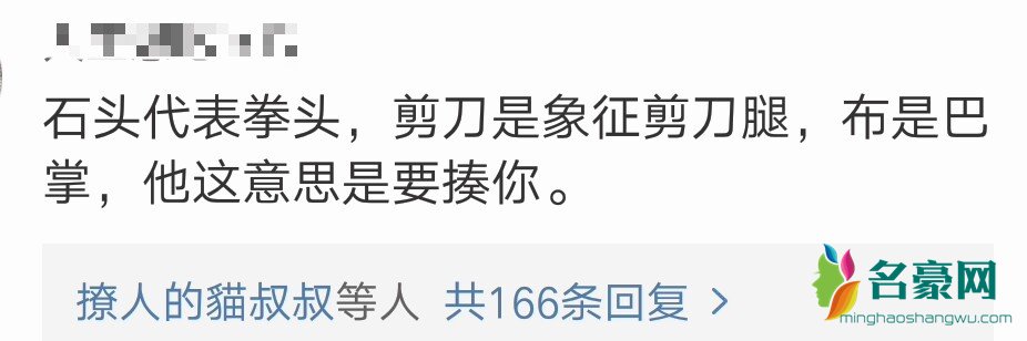 一网友回复石头代表拳头,剪刀是象征剪刀腿,布是巴掌,他这意思是要揍你。这个解答深得单身狗们的心啊,让人觉得非常的有道理。