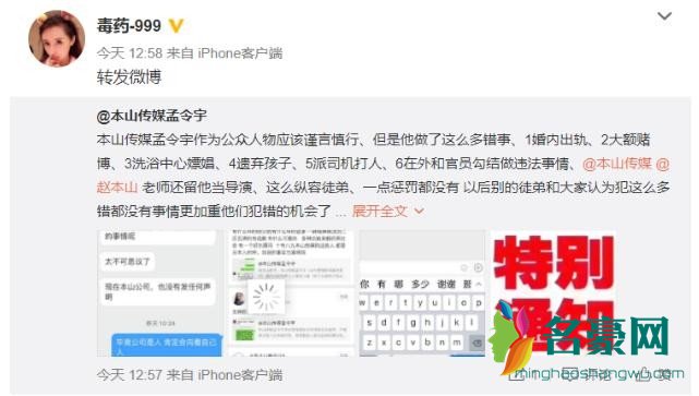 7月1日,有一名叫做“毒药-999”的微博用户在微博上举报赵本山徒弟孟令宇出轨、赌博、嫖娼、勾结官员等一系列行为!并且还晒出了证明孟令宇所做行为的证据。