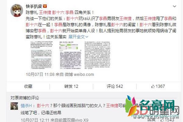 网上的爆料大概意思就是说,彭十六玩ks的时候认识了另外一位美女网红李晶的男朋友王传捷,然后王传捷就甩了李晶和彭十六走到了一起,而李晶呢又是陈意礼的偶像,陈意礼和彭十六是闺蜜关系,于是看到陈意礼在安慰李晶的彭十六为了洗清自己小三的嫌疑开始卖单身人设,等到别人说起做小三抢男朋友的事情后直接顺势把锅甩给了闺蜜陈意礼,这场网红之间的勾心斗角大家看懂了吗?