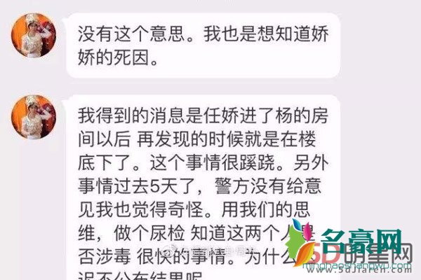 任娇为什么会死亡呢?唯一的一个联系人就是杨旭文,杨旭文在任娇死后不久,就带着两个女孩子去了自己的家中,令很多人怀疑任娇和杨旭文之间不清楚,在当时两个人合作过,而且是关系很好,很多人认为任娇和杨旭文肯定是情侣,但是不是,据说是经纪公司的高层内部出现的问题, 杨旭文本人也是一个受害者,是想要掩饰任娇吧!