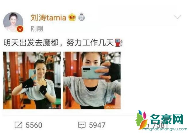 在7月15日,刘涛在微博上晒出了两张素颜健身照!并且配文道:“明天出发去魔都,努力工作几天。”照片中刘涛身穿宽松的运动服,脸上露出甜美的笑容。