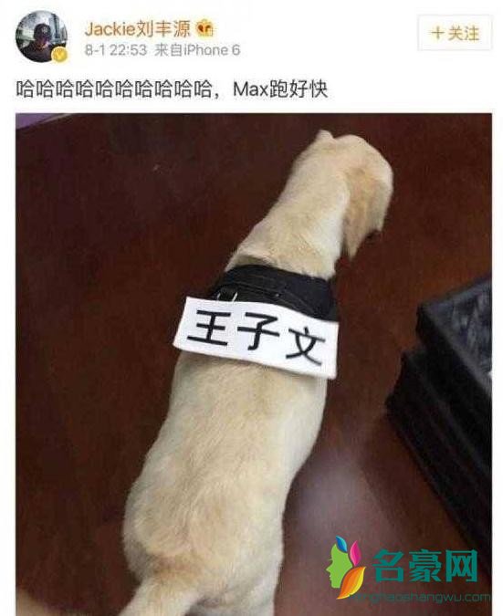而刘丰源的微博名字叫做“Jackie刘丰源”,曾在微博上晒出一条狗背上贴有王子文名牌的照片,并且翻开刘丰源的记录,可以发现刘丰源经常在微博上晒出王子文的照片,大秀恩爱!