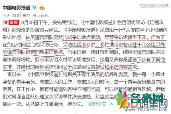 吴谨言到底是做了什么吧?吴谨言好像和中国电影报道的人进行了相关采访,摄制组已经是早到了,只是没有想到接收到了吴谨言经纪人说拍摄地点已经是更改了,为了方便吴谨言,团队只是能够默默的继续前往约定的地方,没有想到吴谨言人没有到,结果是让摄制组付出场地费等等,令当时的制作组非常生气, 结果则是没有采访成功!