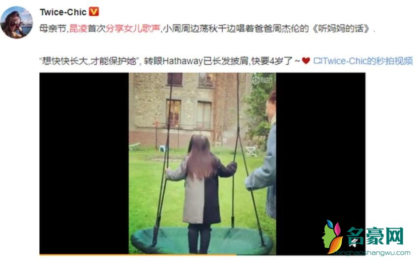 近日,昆凌在社交平台上分享了一段视频,视频中,昆凌女儿边荡秋千边唱着周杰伦的歌曲,昆凌女儿唱着《听妈妈的话》这首歌,从歌声中可以听得出来,昆凌女儿全程音准在线,完全继承了爸爸的优秀基因。