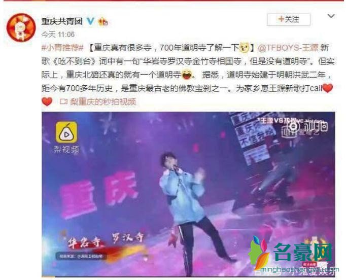 但是由于歌词里面有一句“华岩寺罗汉寺金竹寺相国寺,但是没有道明寺”,引起了重庆共青团官方的注意,重庆共青团官方调侃道:重庆还真的有道明寺!直接打脸王源。